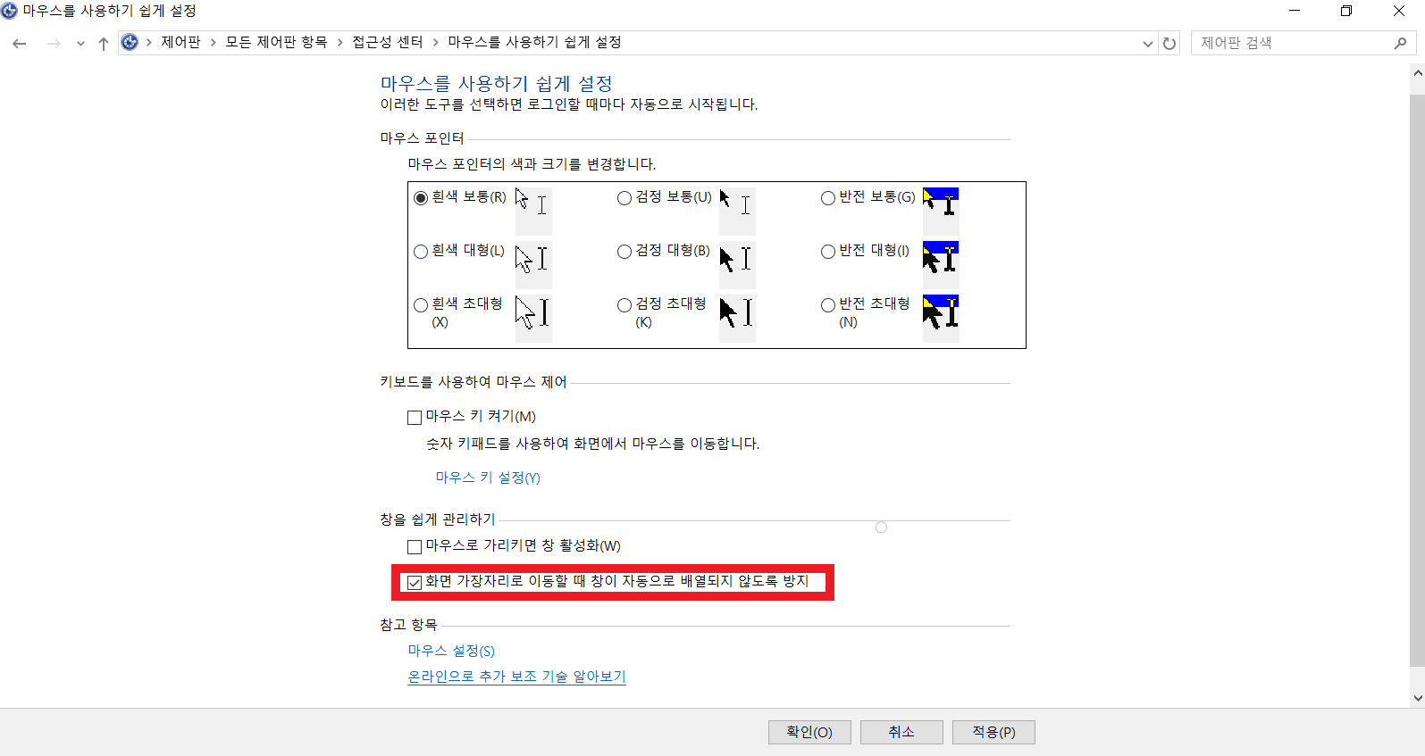 4. 화면가장자리로 이동 할때 자동으로 배열되지 않도록 방지 체크해주고 확인 클릭해주시면 이제 더이상 윈도우 창을 화면 테두리로 옮기더라도 자동으로 전체화면이 되지 않을 것입니다.