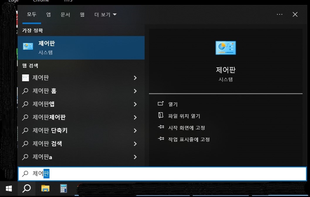 1. 윈도우 하단 바에서 돋보기 모양의 검색창에 제어판이라고 치고 엔터를 누르자.