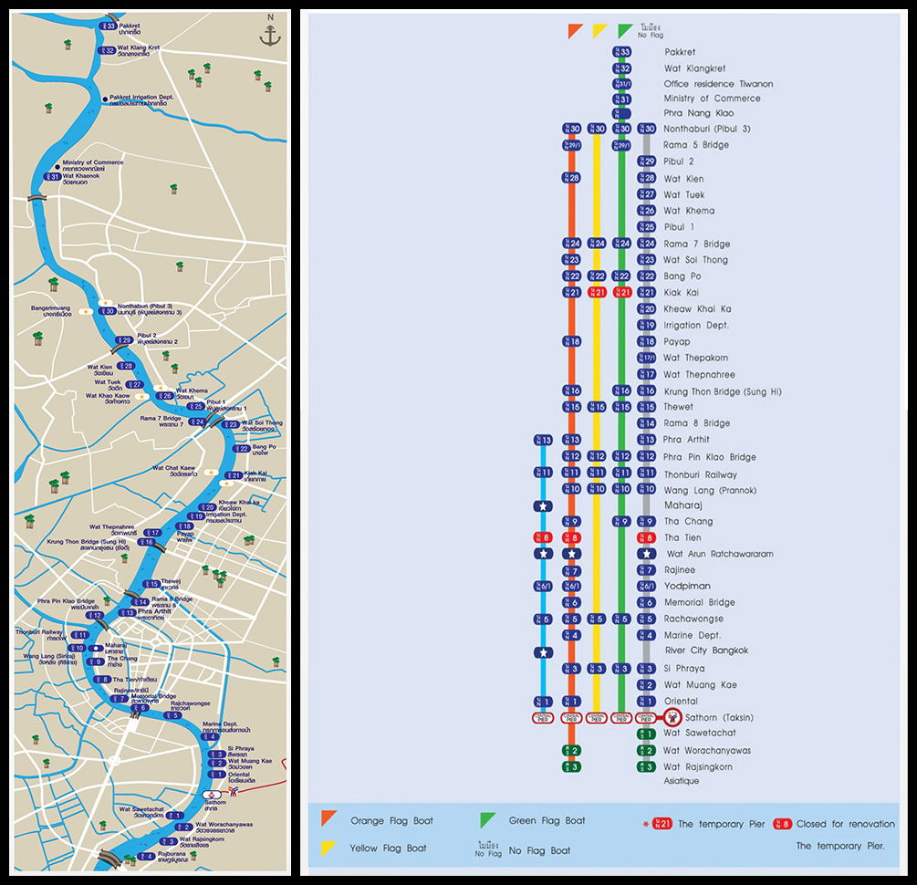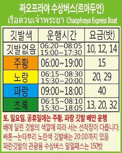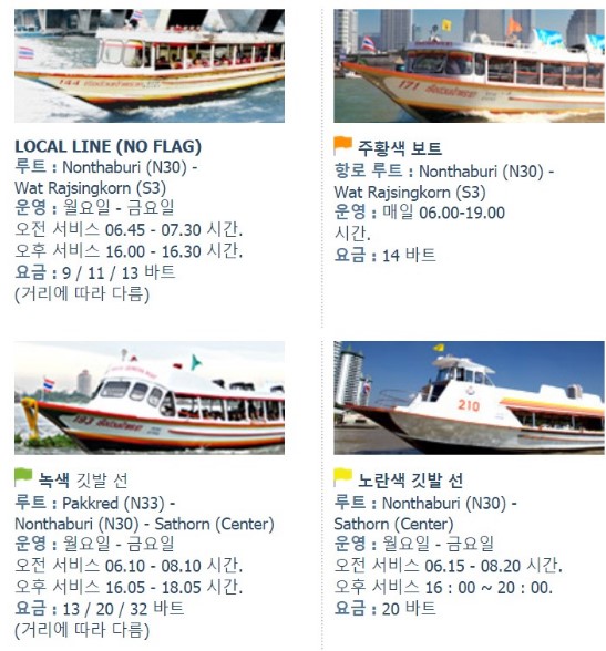 오렌지색 깃발을 단 익스프레스 보트는 논타부리에서 싸톤 (Sathon)까지 월~토 러시아워 시간에 운행되며