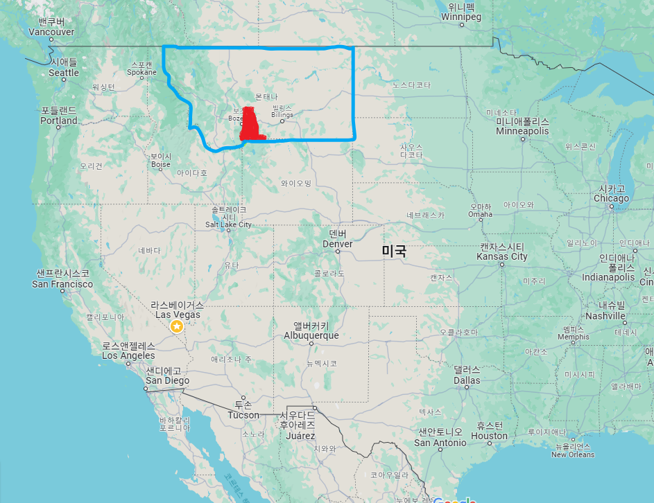 지도에서 파란 테두리가 몬태나 주 경계이고 그 안에 있는 빨간색 행정구역이 파크 카운티입니다.