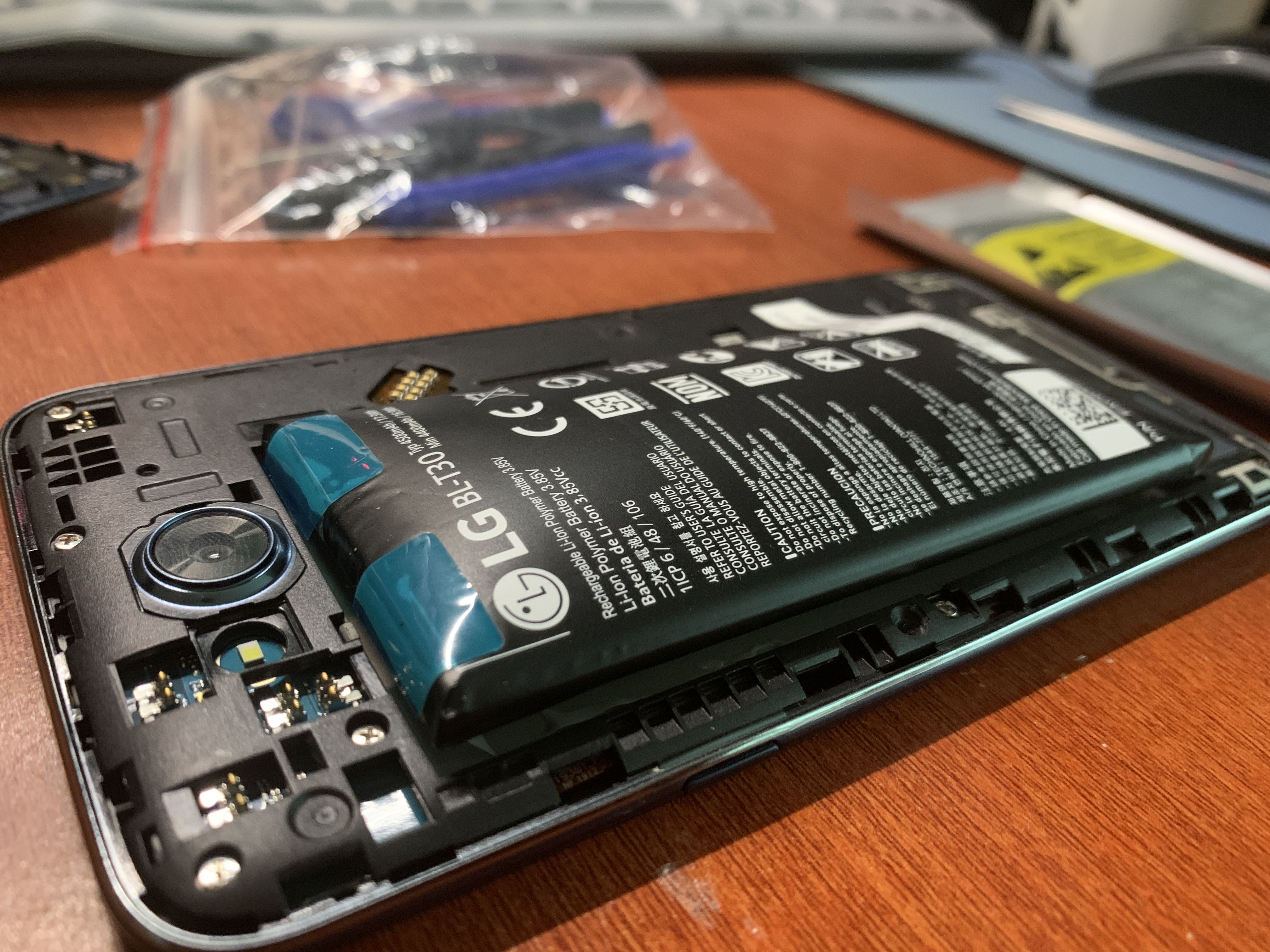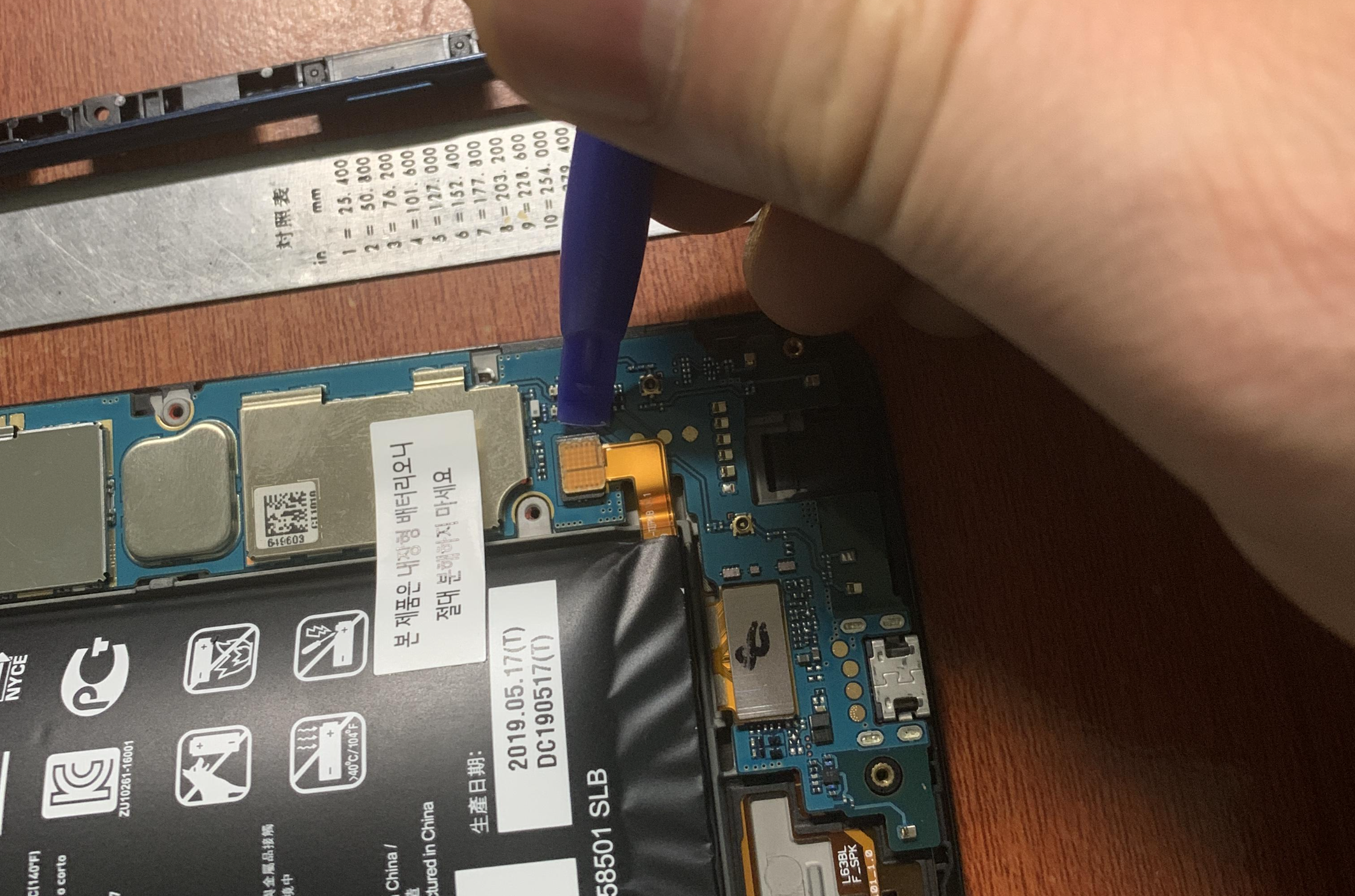 일단 뒤커버를 힘들게 여시고 나면 엄청나게 배가 불러와 있는 배터리를 보실 수 있을 겁니다. 하지만 이건 시작입니다. 웃긴 게 이 상태로 배터리를 분리할 수 없는 구조입니다. 진짜 옛날 배터리 교체식 폰으로 제작 안 하고 왜 이런 식으로 만드는지 정말 화가 나는 건 폰 분리 할 때마다 느끼는 어쩔 수 없는 감정입니다. 이 x5폰은 특이한게 여기서 다시 저 검은 커버를 하나 더 분리해줘야 배터리를 분리할수 있더군요... 무슨 배터리 하나 교체하는데 커버를 두개나 열어야하는지...누가 설계했는지 참 대단합니다. 자가 수리 못하도록 일부러 이런 식으로 만든게 아닌가 생각됩니다..