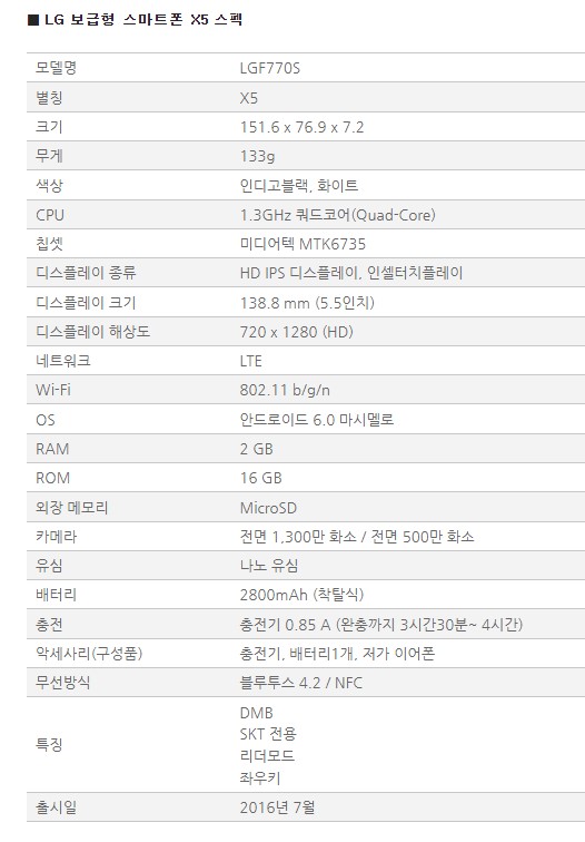 아버지께서 서브 폰으로 애용하시던 이제 추억이 되어버린 LG X5가 결국 고질적 문제로 거론되던 배터리 부풀어 오름현상으로 배터리 교체를 하게 되었습니다. 지금은 사업을 접은 LG전자가 내놓은 보급형 스마트폰으로 당시 어르신들에게 많이 팔린 제품 중 하나입니다. 지금도 여전히 어르신들에게 저렴하게 팔리고 있다고 하니 스테디셀러쯤 됩니다. 과한 기능도 없지만 그렇다고 쓸모없는 성능도 아닙니다. 아주 필수적인 성능만으로 쾌적한 사용 환경을 지닌 준수한 스마트 폰입니다. 이글을 쓰게된 이유도 바로 여전히 이 스마트폰을 쓰시는 분들이 의외로 많으시기 때문에 여전히 사용하시는 분들께 도움이 되지 않을까해서 입니다. X5의 스펙은 다음과 같습니다. 8년전 폰이지만 어르신들이 인터넷 서핑을 하시거나 유튜브 시청하시는데 전혀 문제가 없는 실용적인 폰임에 틀림없습니다.