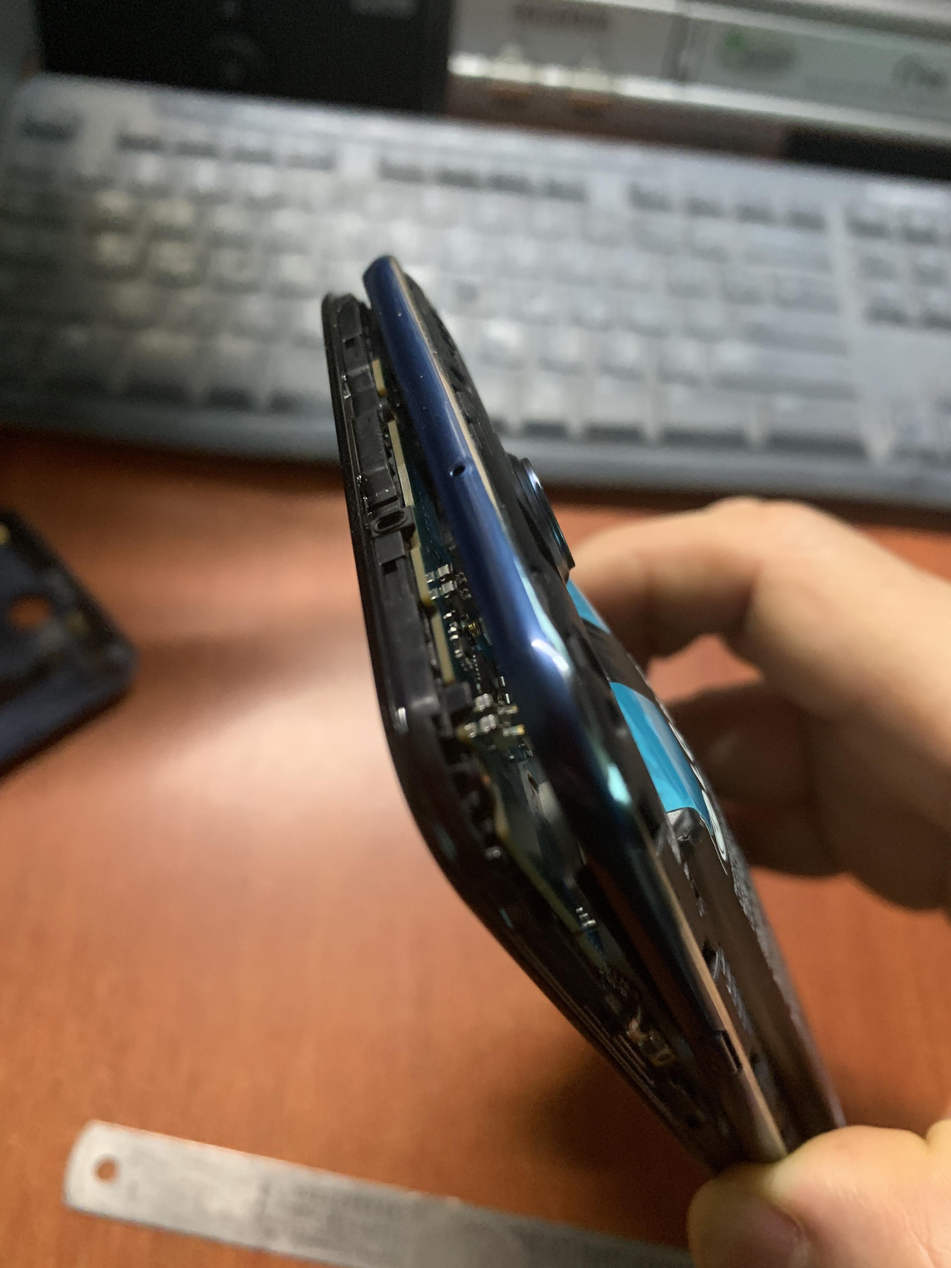 아래 사진처럼 배터리가 부풀면서 이미 본체와 뒷 커버가 벌어져 있기에 그 틈 사이로 헤라를 넣어 힘을 줘서 당기듯 들어 올려 줍니다. 솔직히 이게 말이 쉽지 그렇게 잘 안됩니다. 어느 정도 스크레치는 감수하고 벌려줘야 합니다. 그리고 위 사진을 참고해서 각 후크 돌출 부위를 기억하시고 해당 부위로 헤라를 밀어 준후 후크가 있을 법한 위치에서 하나씩 들어서 분리를 시켜 주는 식으로 한바퀴 쭉 돌아가며 분리해 줘야합니다. 근데 너무 겁먹지 말고 어느 정도 강하게 들어줘야 분리됩니다.