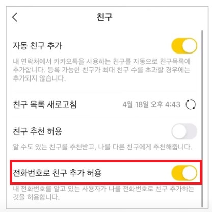 이 기능을 꺼두시면 상대가 내 번호를 알고 있더라도 친구로 등록하려고 하면 친구등록 불가 메시지가 뜹니다. 이런 식으로 내가 허용한 친구가 아닌 이상 내 번호 만으로 내 프로필에 접근해 정보를 볼 수 없게 하는 기능인 겁니다.