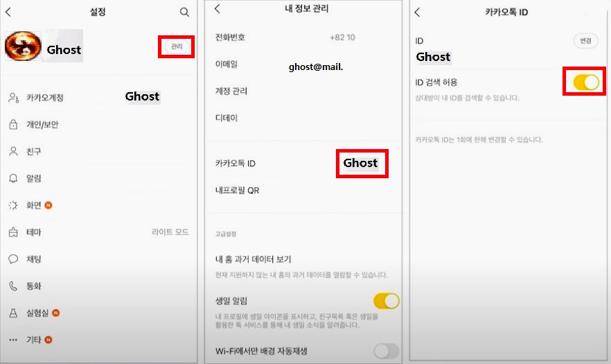 우선 카카오톡 메인 화면 우측 상단의 톱니바퀴를 눌러주면 뜨는 창에서 전체 설정창으로 눌러줍니다. 그리고 설정창에서 프로필 사진 옆 관리 버튼을 눌러주면 내 정보 관리 창이 뜨는데 아직 카카오톡 ID를 만들지 않았다면 카카오톡 ID를 만들어줍니다. 카카오톡 ID가 만들어졌다면 ID를 클릭해서 들어가 주면 ID검색허용 버튼이 나올 겁니다. 이걸 활성화시켜주면 됩니다. 그러면 이제부터는 전화번호가 아닌 내가 알려주는 내 카톡 ID를 아는 사람만 나를 친구로 등록할 수 있게 됩니다.