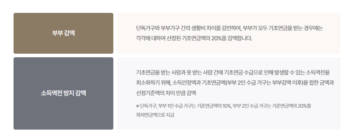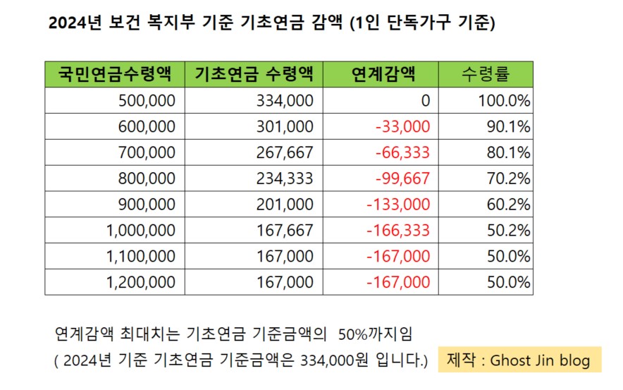 여기서 보듯 최대치로 감액된다 하더라도 50%까지인 167,000원을 넘지 않습니다. 다시 말해 국민연금을 아무리 많아 받아도 기본적인 기초연금 수령 자격 조건인 하위 소득 70% 이내에만 들어간다면 최하 기초연금 167,000원을 수령가능하다는 사실입니다. 그러니 굳이 기초연금을 감액 없이 100% 다 받겠다고 국민연금 납부 금액을 줄여봐야 국민연금 + 기초연금 총 수급 최대치가 줄어들 뿐입니다.