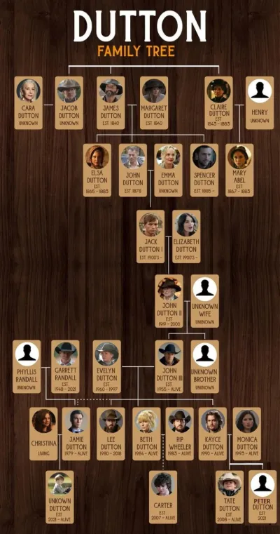 옐로우스톤, 1883, 1923 더튼 가문 가계도 그리고 알려지지 않은 아들들.