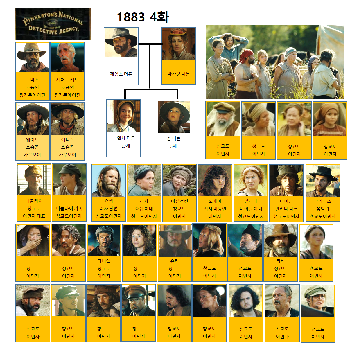 이상 1883 4화 서부 개척민들은 왜 열차를 타지 않았을까에 관해 알아보았습니다. 드라마를 보심에 있어 많은 배경 지식이 되시길 바라며 더욱 알찬 드라마 감상이 되시길 바랍니다. 마지막으로 에피소드 4에 나오는 등장인물을 정리한 그림을 올리면서 글을 마칠까 합니다. 오늘하루도 모두 행복하세요.