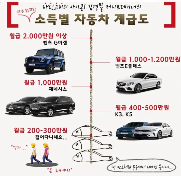 어찌 보면 이런 표로 경제적 계급을 나눈다는 게 왠지 부정적으로 보이고 반발심이 생기기도 하지만 계급을 나눈다기보다는 나의 미래 삶의 목표를 잡는 기준으로 삼는 게 적절할 듯합니다. 내가 몇 년 후에는 급여 1000만 원 되도록 열심히 자기 계발하고 더 나은 모습으로 발전해서 언젠가 벤츠 E클래스를 타겠다. 이런 목표 말이죠. 모든 건 생각하기 나름이니 좋은 쪽으로 생각하면 어떨까 합니다.