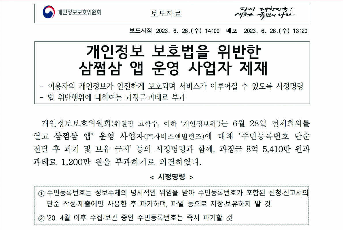 또한 개인정보 보호위원회는 지난해 6월 삼쩜삼의 운영 사업자인 자비스 앨런즈에 대해 개인정보 보호법 위반으로 과징금과 과태료를 부과하기 했습니다. 당시 삼쩜삼은 개인 주민등록 번호를 통한 홈택스 로그인 아이디와 비번 및 소득정보 그리고 카드와 건강정보 등의 민감한 개인 정보를 수집하고, 세무대리인 수임동의, 환급신고 대행 등의 과정에서 개인정보 처리 방침을 제대로 고지하지 않았기 때문이라고 합니다. 이에 따라 개인정보위는 주민등록 번호의 보유 및 사용에 대해 시정명령을 내렸기에 지금은 그 약관 조항이 폐지되었다고 합니다.