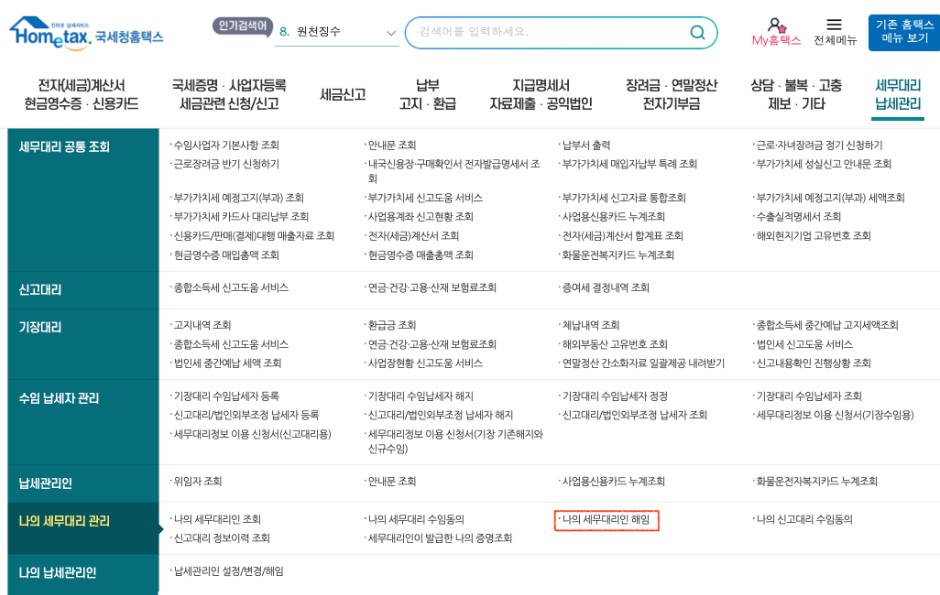 이를 확인하는 방법은 홈택스에서 나의 세무 대리인 조회를 통해 바로 확인이 가능하고 필요시 해임 절차를 진행하시면 됩니다.