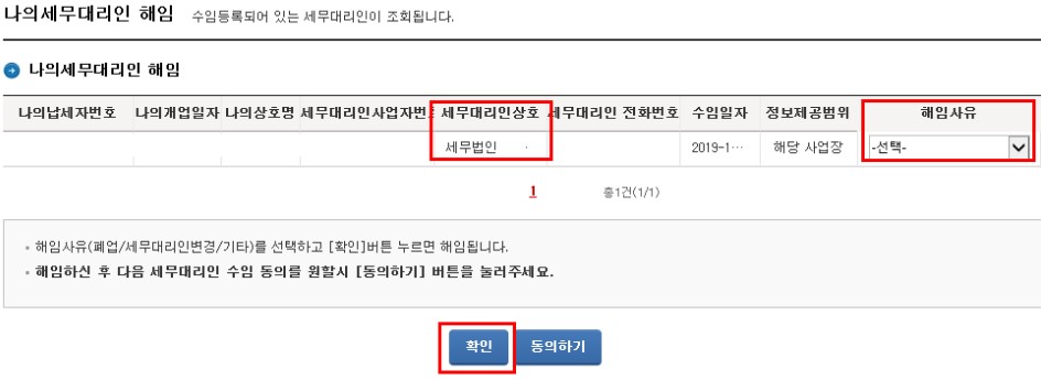 2. 기존 세무대리인 상호명 확인 > [해임사유] 선택 > [확인] 클릭