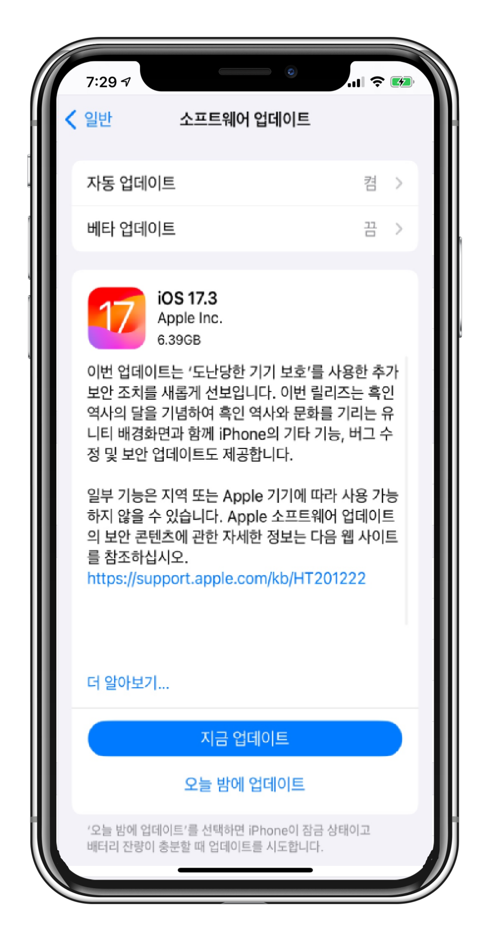 업데이트 방법은 설정 > 일반 > 소프트웨어 업데이트 > 지금 업데이트