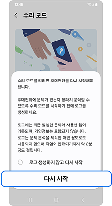 설정 > 디바이스 케어(또는 배터리 및 디바이스 케어) > 수리 모드 > 켜기 > 다시 시작