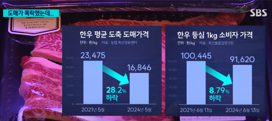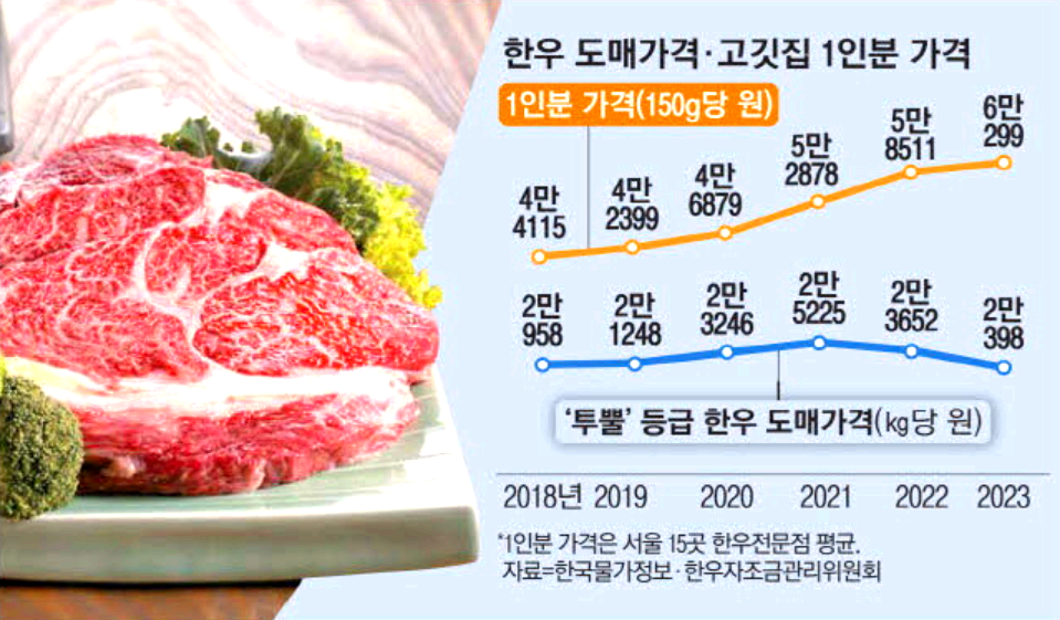 2024년 5월달 한우 평균 도축 도매가격은 1kg당 작년 23,475원에서 16,846까지 28.2%폭락했지만 소비자가는 작년 6월 100,445원에서 91,620원으로 8.79%하락하는데 그쳤습니다. 반면 식당에서의 가격은 오히려 인건비와 물가 상승으로 꾸준히 상승해서 1인분 한우 가격이 6만원대를 넘어섰습니다.