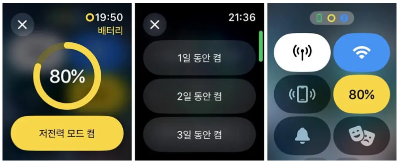 애플 워치는 최소한의 일반기능만 유지한채 저전력 모드로 사용시 38시간 정도 사용가능하고 최소 기본 기능만 유지한채 저전력 모드를 사용시 최대 60시간까지도 사용가능합니다. 혹시 전날 충전을 깜빡해서 배터리 잔량이 부족하거나 하루 종일 충전 할 수 없는 상황이 발생했을 때 미리 절전모드를 켜 둔다면 충전없이도 최대한 워치가 꺼지지 않은채 하루에서 이틀 정도는 사용할수 있습니다.