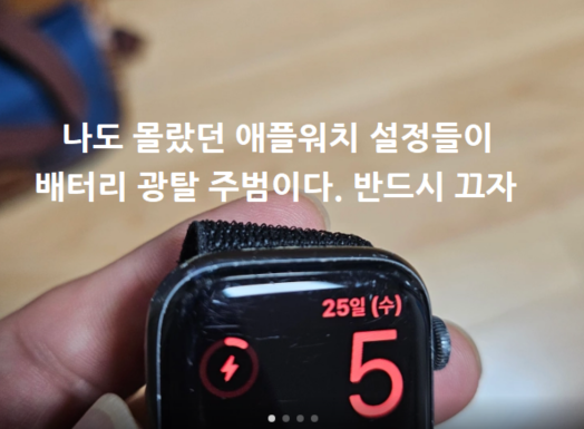 애플워치의 배터리를 절약하기 위해 여러가지 설정법들이 많습니다. 이런 설정들 다 설정 했는데도 내 애플워치가 광탈한다고 느끼신다면 이게 배터리 광탈의 주범입니다. 잘 쓰지도 않는... 그래서 사용 중지 할 생각도 못한 활용도가 떨어지는 설정들을 끔으로서 소중한 배터리가 광탈하는 걸 방지 해 봐요.