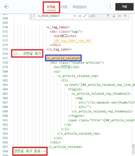 4. <s_article_related> 코드를 기준으로 앞에는 <!-- 관련글 제거 라고 붙여주고 코드 문장이 끝나는 </s_article_related> 뒤에는 관련글 제거 종료--> 라고 입력합니다.