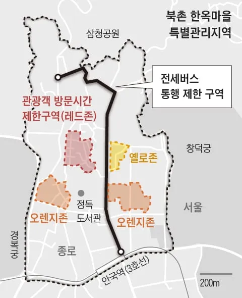- 오렌지존: 북촌로5가길과 계동길 일대로, 주거용 한옥과 카페, 식당 등이 섞여 있는 지역입니다. 이곳은 방문 시간을 제한하기보다 구청 직원들이 계도할 예정입니다.