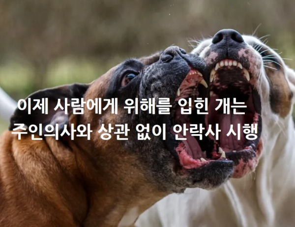특히 맹견사육허가제가 본격 도입되며 사람에게 직접적인 위해를 가한 개를 견주 동의 없이도 안락사시킬 수 있게 됩니다. 그러니 만일 내 강아지가 한번이라도 사람을 사람을 문 경험이 있다면 전문가를 통해 행동교정을 반드시 받아야 합니다. 이제 사람에게 직접적으로 위해를 끼치면 그냥 합의하고 끝나는 게 아닙니다. 사람에게 위해를 입힌 개는 안락사 됩니다. 그러니 우리개는 안물어요 이런 말만 하다 금전적 손해와 고소 고발을 물론 사랑하는 애견과 영원히 이별하는 감당하기 힘든 상황에 놓이지 않으시길 바랍니다. 강아지에게도 일종의 사형제도가 만들어 졌다고 생각하시면 됩니다.