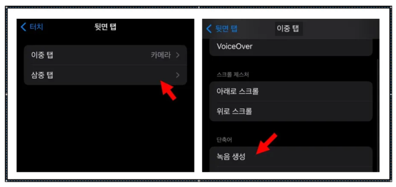 6. 뒷면탭 항목에서 이중탭 혹은 삼중탭 중 원하는 동장을 선택하세요. 이중탭이 반응하기 쉽지만 실수로 이중탭 되어 오작동 우려가 많이 생기신다면 삼중탭으로 선택하시면 됩니다. 전 빠른 녹음을 위해 이중탭을 선호합니다.