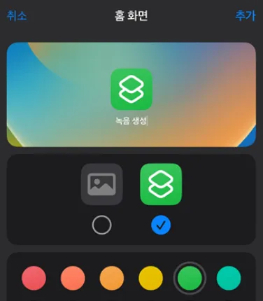 3. 원하는 바탕화면 아이콘 모양을 만들어주는 홈화면이라는 창이뜨면 아이콘으로 쓸 사진을 선택하거나 원하는 색상을 선택해 추가를 눌러주면 바탕화면에 내가 만든 아이콘이 만들어집니다. 이제 그 버튼만 누르면 바로 녹음이 시작 됩니다 .