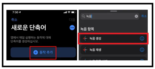 4.검색창이 나오면 녹음생성이라고 써주면 항목이 나타납니다. 녹음생성을 선택해주세요. 단축어는 끝났습니다.
