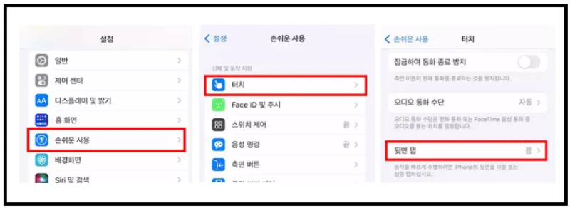 5. 이제 아이폰 설정에서 손쉬운 사용 > 터치 > 뒷면탭을 선택하세요.