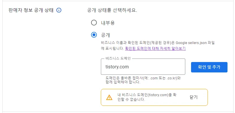 하지만 티스토리 블로그와 같은 블로그 플랫폼을 사용하는 경우는 비즈니스 도메인을 채우지 않아도 무방합니다.비즈니스 도메인을 입력하기 위해서는 최상위 도메인을 제공해야 하는데, 티스토리 블로그의 경우 최상위 도메인의 경우에는 광고 공간 판매자인인 블로거 본인 소유의 것이 아니기 때문에 정보를 입력할 수 없는 것입니다. 이건 티스토리 회사 본인이 직접 입력할수 있는 영역이기에 개인 블로거가 할수있는건 아닙니다.