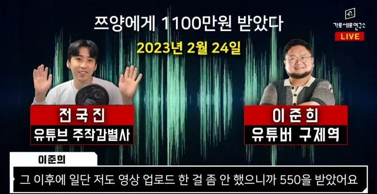 가세연에서 밝혔듯 구제역 전국진을 녹취록에서 쯔양의 전 소속사 대표 즉 전 남자친구를 자주 만난것으로 보입니다. 그리고 쯔양이 밝힌 내용에서도 전남친이 이들을 만나 과장된 내용을 유포하며 자신을 압박했다고 주장했습니다. 이것으로 볼때 구제역과 전국진은 쯔양의 전 남자 친구로 부터 쯔양의 과거 행적을 들었고 이것을 녹취파일로 가지고 있지 않았을까 하는 생각이 듭니다.