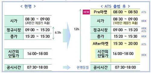 다음은 한국거래소(KRX)와 대체거래소(NXT)의 운영시간 비교표입니다.