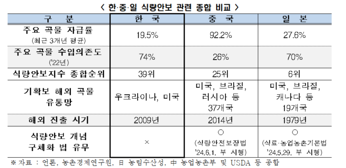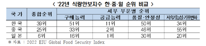 2022년 기준 식량안보지수의 세부 평가지표별 한‧중‧일 순위를 보면, 한국은 113개국 중 ‣식량 구매능력(51위), ‣공급능력(11위), ‣품질 및 안정성(50위) 등 평가항목 4개 중 3개 부문에서 일본과 중국보다 순위가 낮았고, ‣지속가능성·기후변화 적응력 부문에서만 일본과 중국 사이인 34위에 위치했다.