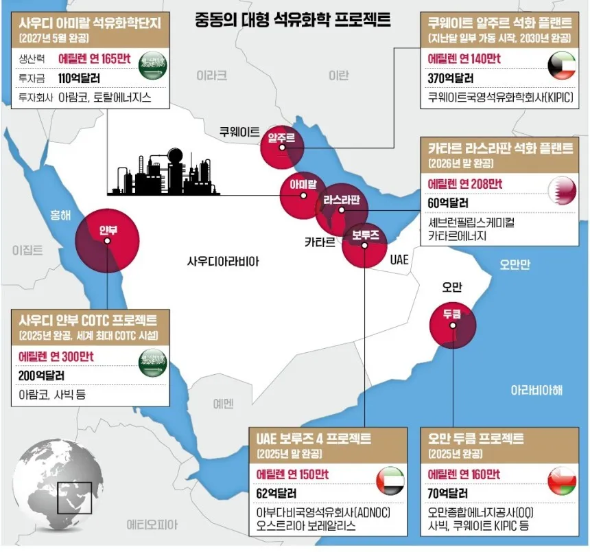 중동 정유사들 역시 탈탄소 시대 석유 수요 감소에 대응하고 석유화학을 차세대 먹거리로 삼겠다는 목표를 세우고 산업을 육성하는 상황입니다. 그렇기에 중국에 이어 중동도 석유화학 증설에 속도를 내면서 국내 석유화학 업계 사이에선 “범용 시장에선 더 이상 경쟁이 어렵다”는 한숨이 나올 정도입니다.. 글로벌 공급 과잉이 본격화한 이후 범용 제품 비중이 높은 기업들의 실적 부진 폭이 컸던 것도 이런 이유에서입니다.