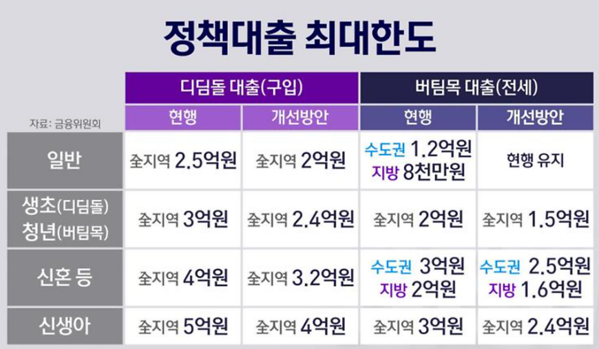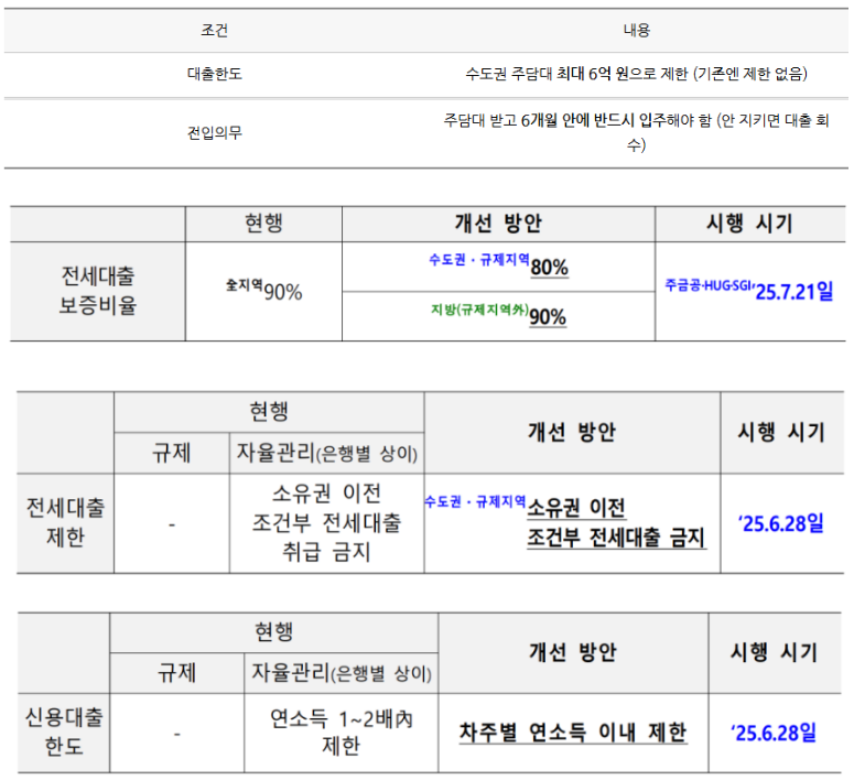 - 이재명 정부는 수도권 및 규제지역 주택담보대출 한도를 6억 원으로 제한하고 다주택자 신규 대출을 금지했다 생애 최초 주택구매자의 LTV를 80%에서 70%로 조정하고 전입 의무화, 갭투자 차단, 대출 만기 단축 등 초강도 규제책을 도입했다. ( LTV는 'Loan to Value'의 약자로, 주택담보대출비율을 의미 합니다. 이는 주택 가격 대비 대출금의 비율을 나타내며, 대출 가능 금액을 결정하는 중요한 기준입니다. )